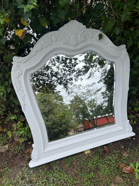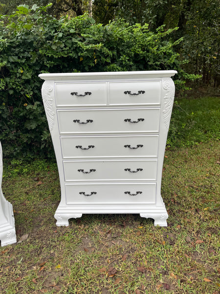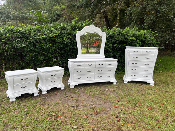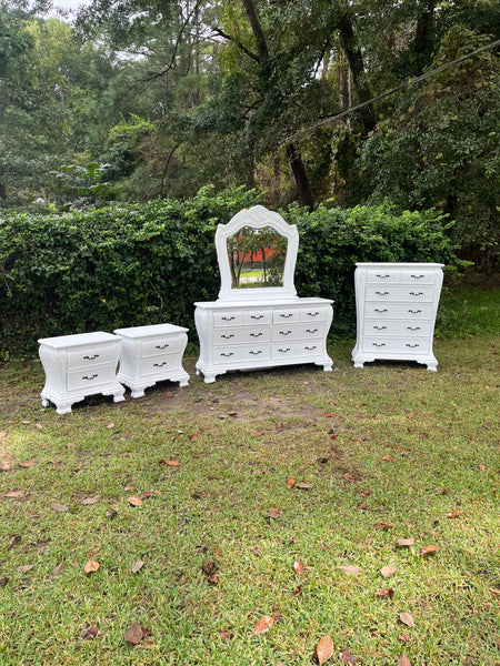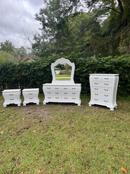 This set includes the dresser with mirror, chest of drawers & two night stands. All pieces are large & oversized, all wood with wood drawer tracts. The set is nice & sturdy. It features fantastic carved details. It been painted in our crisp house white.