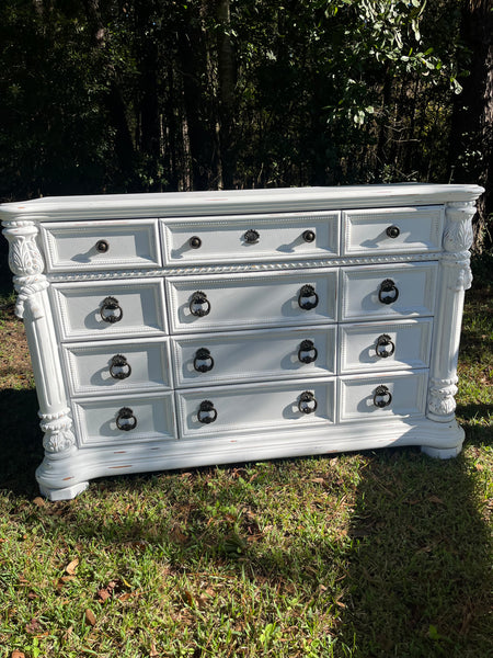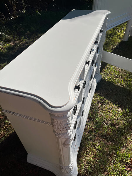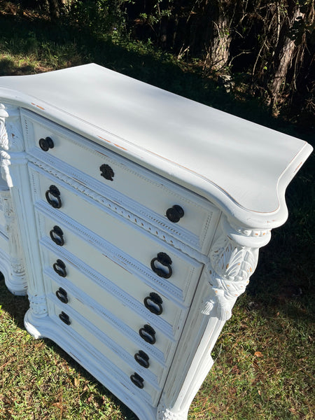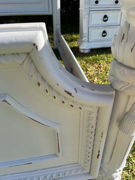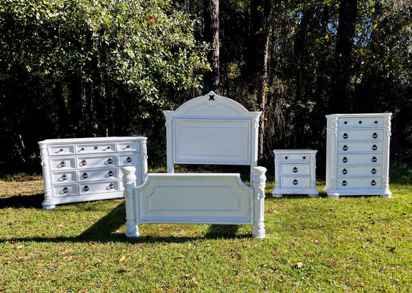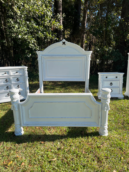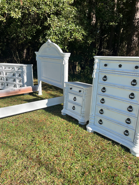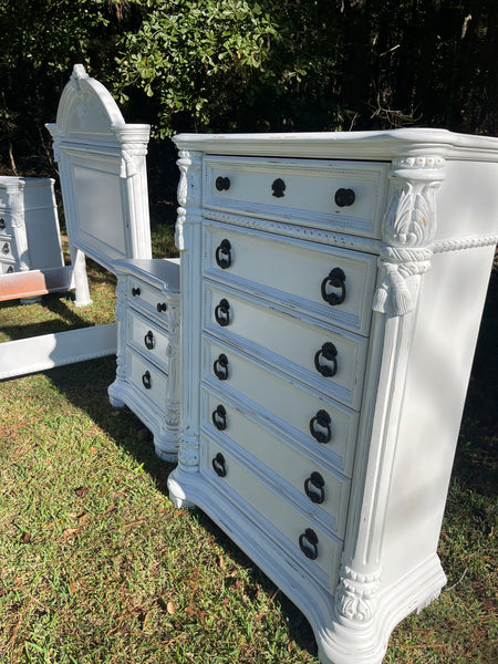 The set includes a tall queen bed (headboard, footboard, side rails) 12 drawer dresser with mirror (not shown) chest of drawers & single night stand. All pieces are very large & oversized. All pieces are sturdy, wood & very heavy. Painted in our house white & distressed on the carved details. All drawers work correctly.
