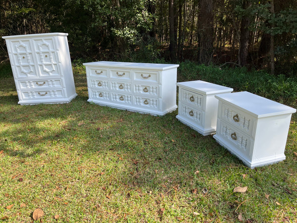 Fabulous designed night stand set in white with gold hardware. This is a good quality set, the drawers are nice & sturdy. Everything opens & closes easily.