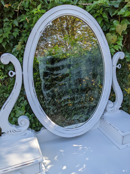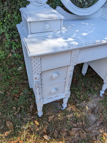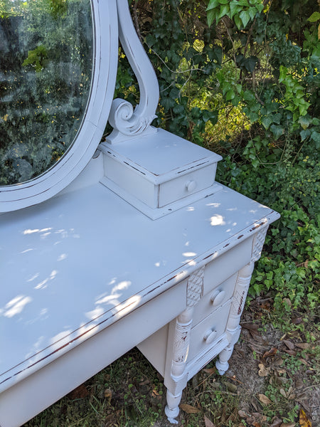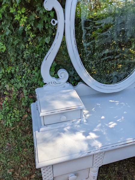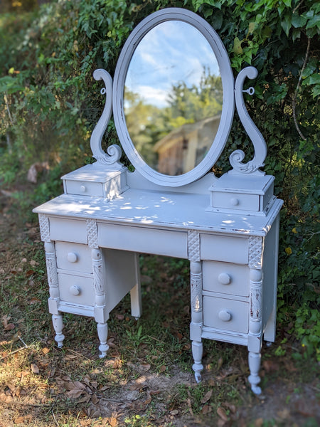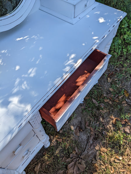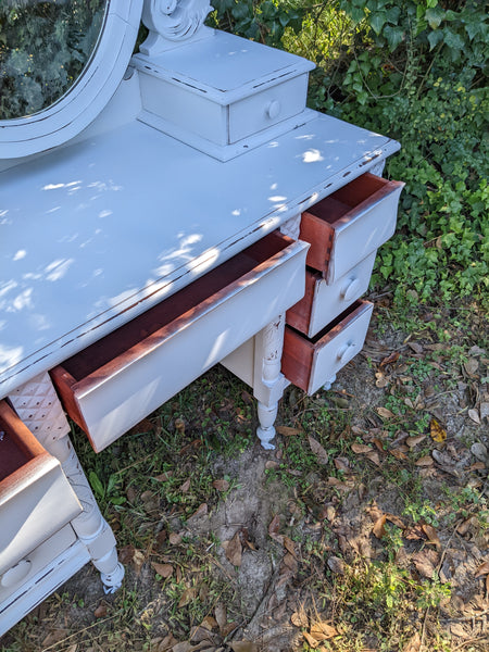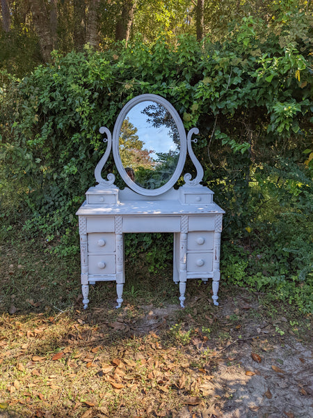 Absolutely stunning antique all wood (mahogany) vanity. Packed with lots drawers for ample storage. The mirror is the original silver mirror & shows some mild signs of it's age (see all pics). Everything works as it should and looks stunning in person!